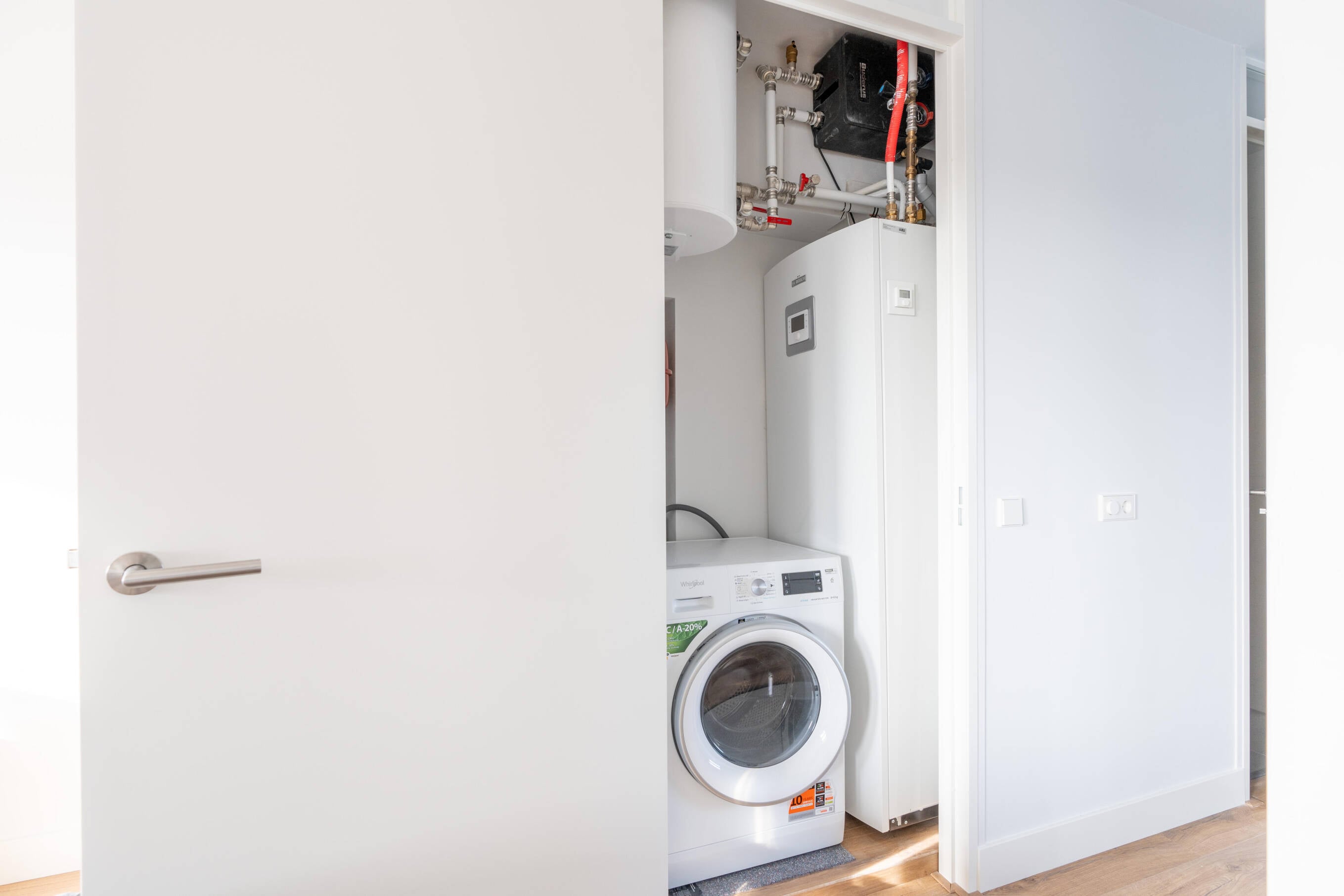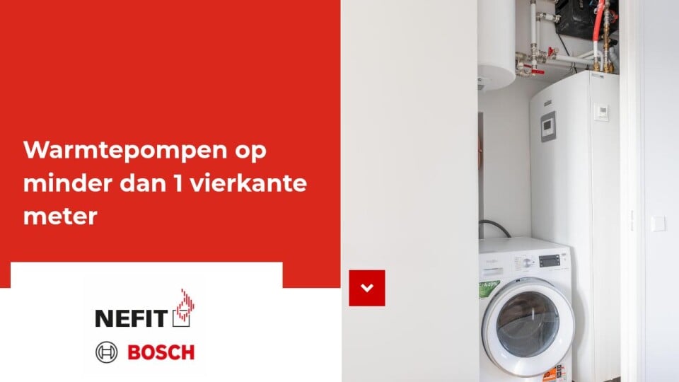 Harry Hartog kwam in gesprekken met Michel Honings van Nefit Bosch en Robin Jansen van Rensa al snel tot de conclusie dat de tower-versie Nefit Bosch 3400i lucht-water warmtepompen in deze omstandigheden de beste oplossing bood. “Elke warmtepomp staat op minder dan 1 vierkante meter. Daar kwam het leidingwerk nog bij, en er moesten ook nog een wasmachine en droger in dezelfde ruimte kunnen staan”, schetst Hartog het plaatje. “Het was zo krap en compact dat het eigenlijk geen doen was. Maar het is ons toch gelukt en de keuze voor de 3400i lucht-water warmtepomp was daar echt cruciaal in. Een ander model had daar gewoon niet gepast, zo simpel is het eigenlijk.”